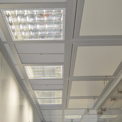 I controsoffitti per camere bianche prodotti da Delta2000 sono costituiti da un telaio ad omega con profilo a vista di 65 mm in estruso di alluminio anodizzato e/o pre-verniciato con pannelli di tamponamento per cleanroom possono essere prodotti in diverse soluzioni. Tutti i materiali impiegati sono certificati autoestinguenti in Classe 1.