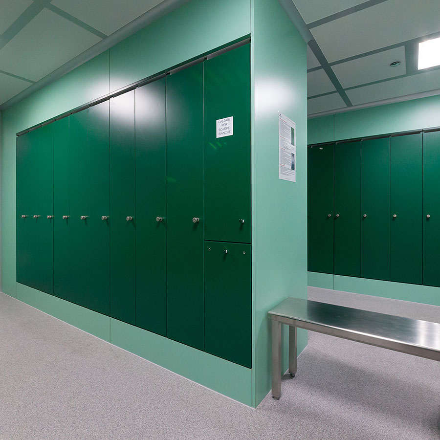 Dotati di pomoli in acciaio inox – anche con serratura – e strutture inclinate antipolvere, permettono di gestire in sicurezza il cambio di abiti e calzature sterili evitando contaminazioni incrociate nelle cleanrooms.